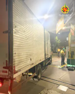 A equipe foi acionada via COPOM após um homem abastecer um caminhão e se recusar a efetuar o pagamento. No local, foram constatados sinais evidentes de embriaguez além de agressividade por parte do condutor.
